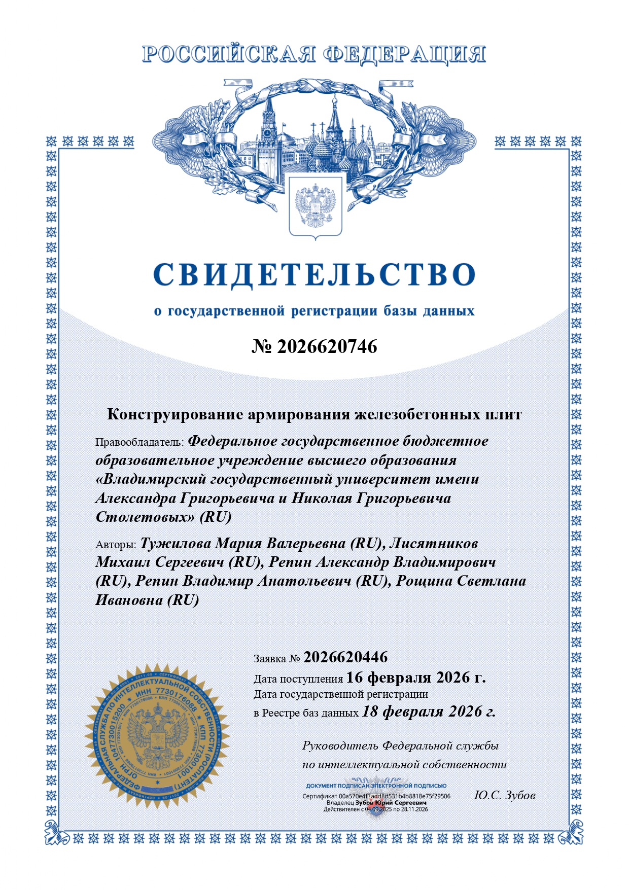 Перечень объектов интеллектуальной собственности, зарегистрированных на ВлГУ(свидетельства о регистрации программ для ЭВМ и баз данных) в 2026 году